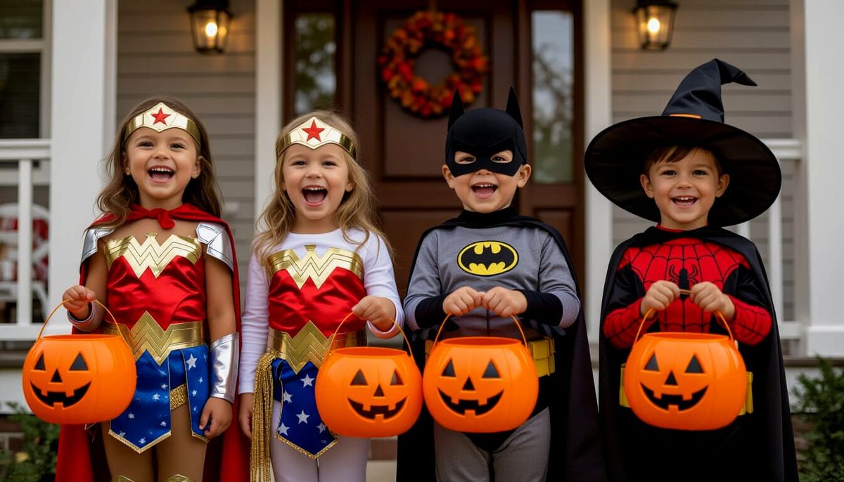This photorealistic image shows excited children in Halloween costumes like Wonder Woman, Batman, and a witch, going door-to-door with pumpkins.