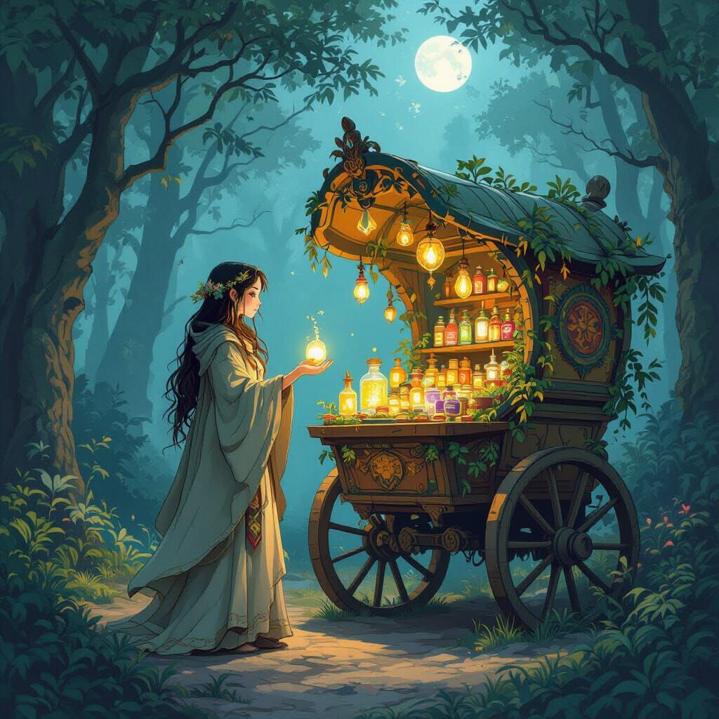 This image shows a druid in a misty forest offering glowing herbal remedies from her cart to travelers. The art style evokes hand-painted Studio Ghibli concept art.
