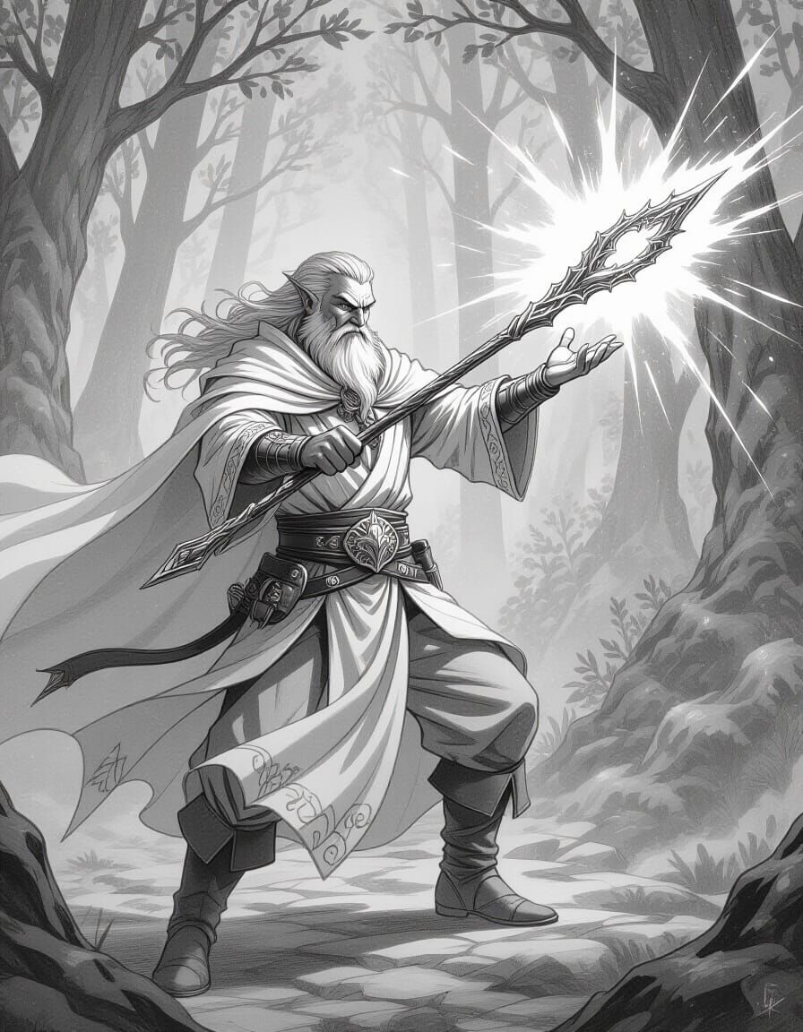 This image shows an anthropomorphic silver dragon sorcerer dancing in a storm. The dragon, rendered in a black and white pencil sketch style, wears robes and a cape, holding a glowing staff in a magical forest.