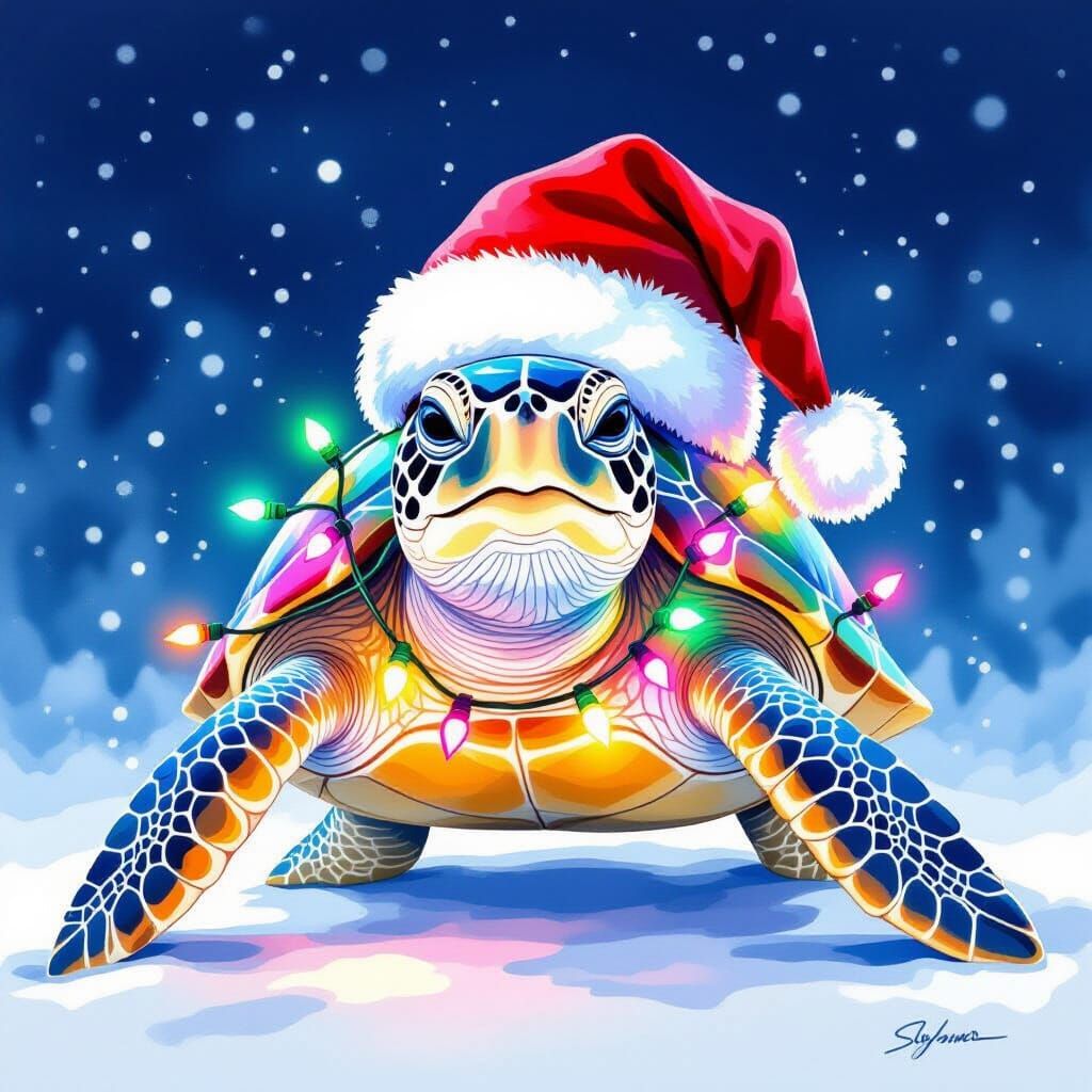 This image shows a majestic sea turtle in a Santa hat with glowing Christmas lights. Rendered in a vibrant, textured watercolor style with digital enhancements, it's perfect for holiday cards.