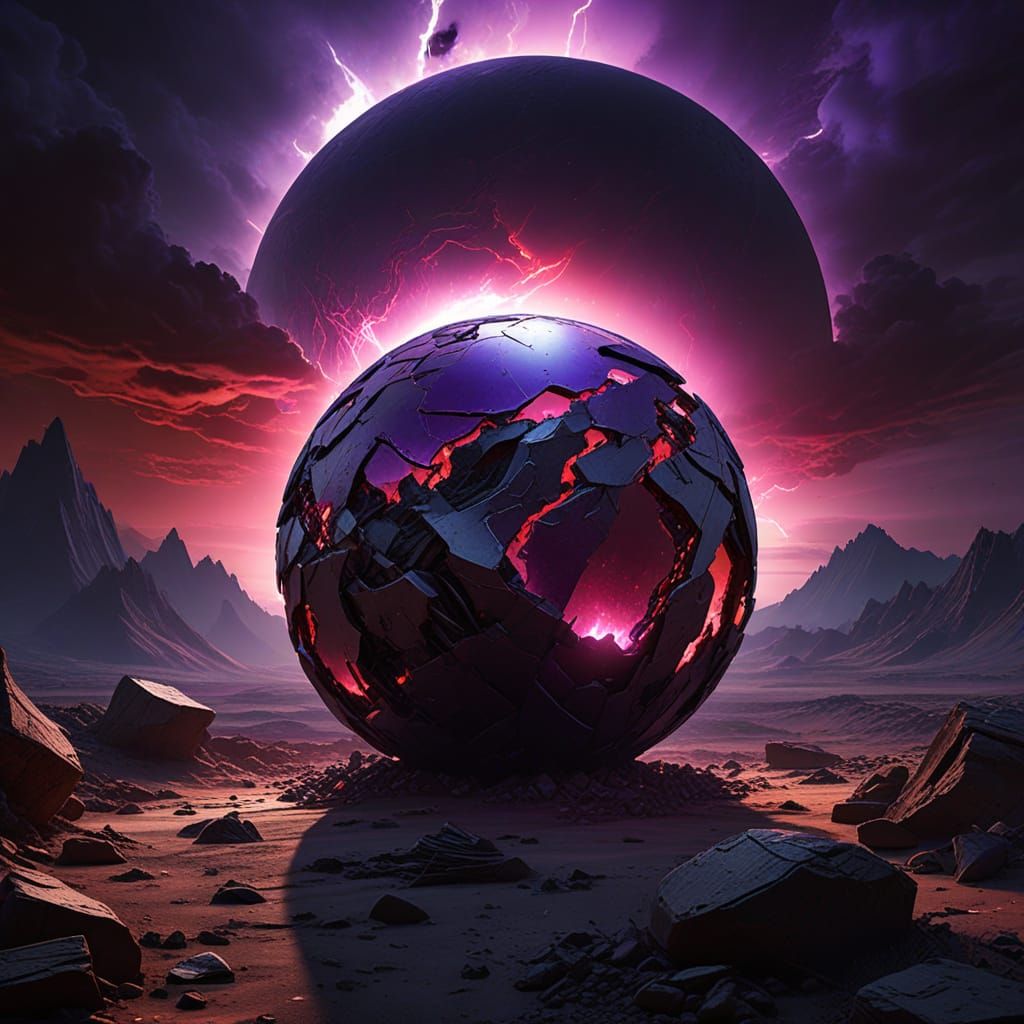 This photorealistic digital art depicts a towering alien device on a barren landscape of black stone. Crimson and ultraviolet energy pulses through the monolith under swirling violet storm clouds.