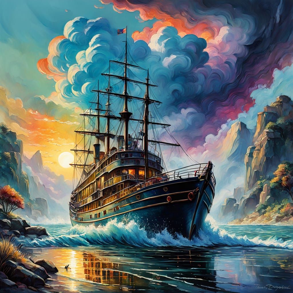 A vibrant neo-impressionistic painting capturing a sunset over the sea with dolphins and a large boat. The artwork employs thick brush strokes and textured layers, reminiscent of graffiti and street art.