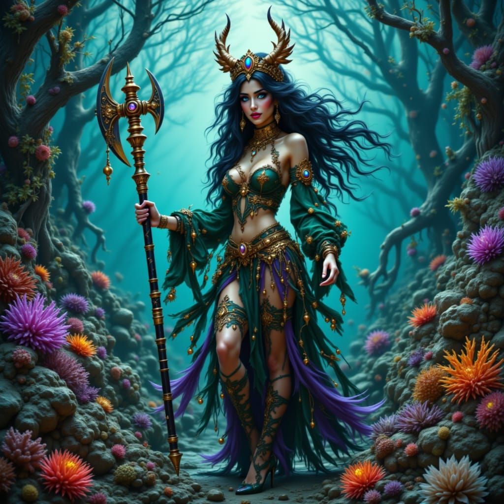 This image shows a regal satyr queen in flowing robes holding a battle axe. The scene is set in an underwater baobab forest with aurora coral reefs, realized with dramatic lighting and intricate details reminiscent of baroque art.