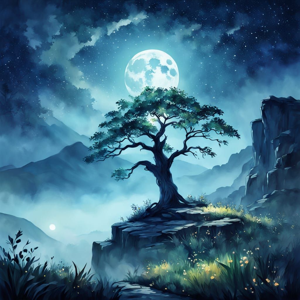 This image captures a dreamy, moonlit scene of a lone, ancient tree standing tall on a misty cliffside, surrounded by delicate, feathery leaves and a twinkling, starry night sky.