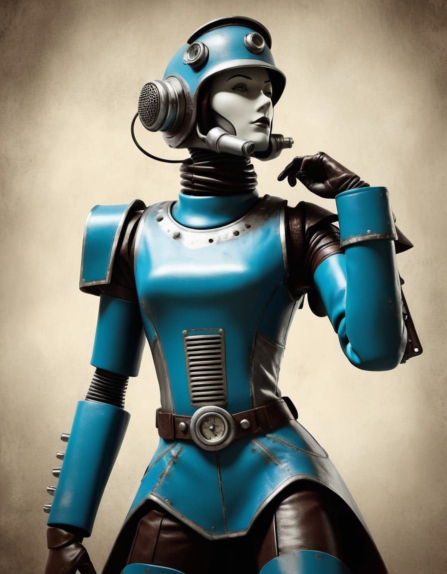 This image shows an android in a dieselpunk style. The artwork features retro-futuristic elements, combining mechanical designs with vintage aesthetics.