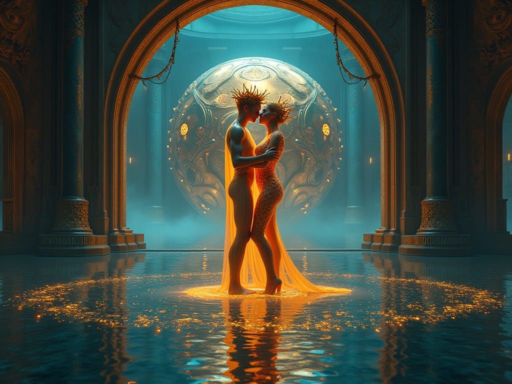 living man image in a framed painting and woman doll outside the painting kissing by glass artist "gilded tenebrism" art deco style living paradigm marbleous afterglow the overall effect is a stunning, 3D chiaroscuro a futuristic fantasy scene with a surreal atmosphere. In the foreground, a masterpiece ...