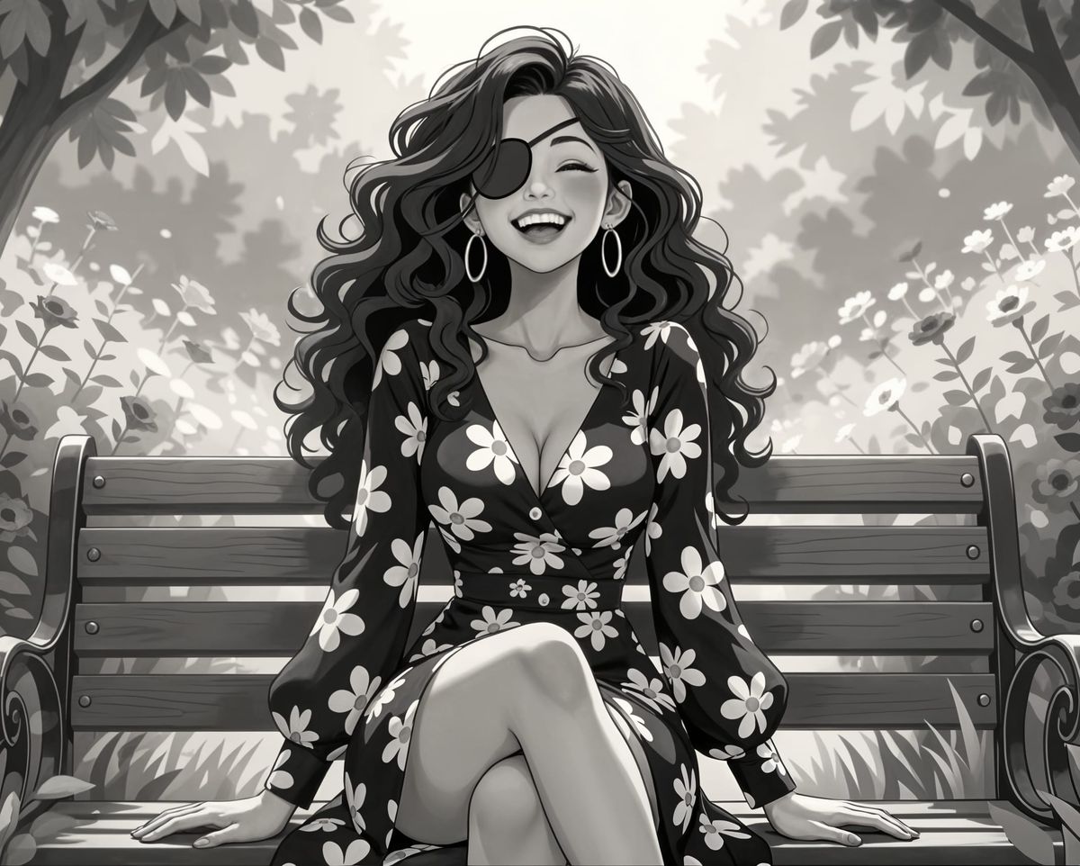 A pencil drawing of a smiling woman with curly hair and an eyepatch, relaxing on a bench in a lush garden. The artwork is reminiscent of classic comic art.