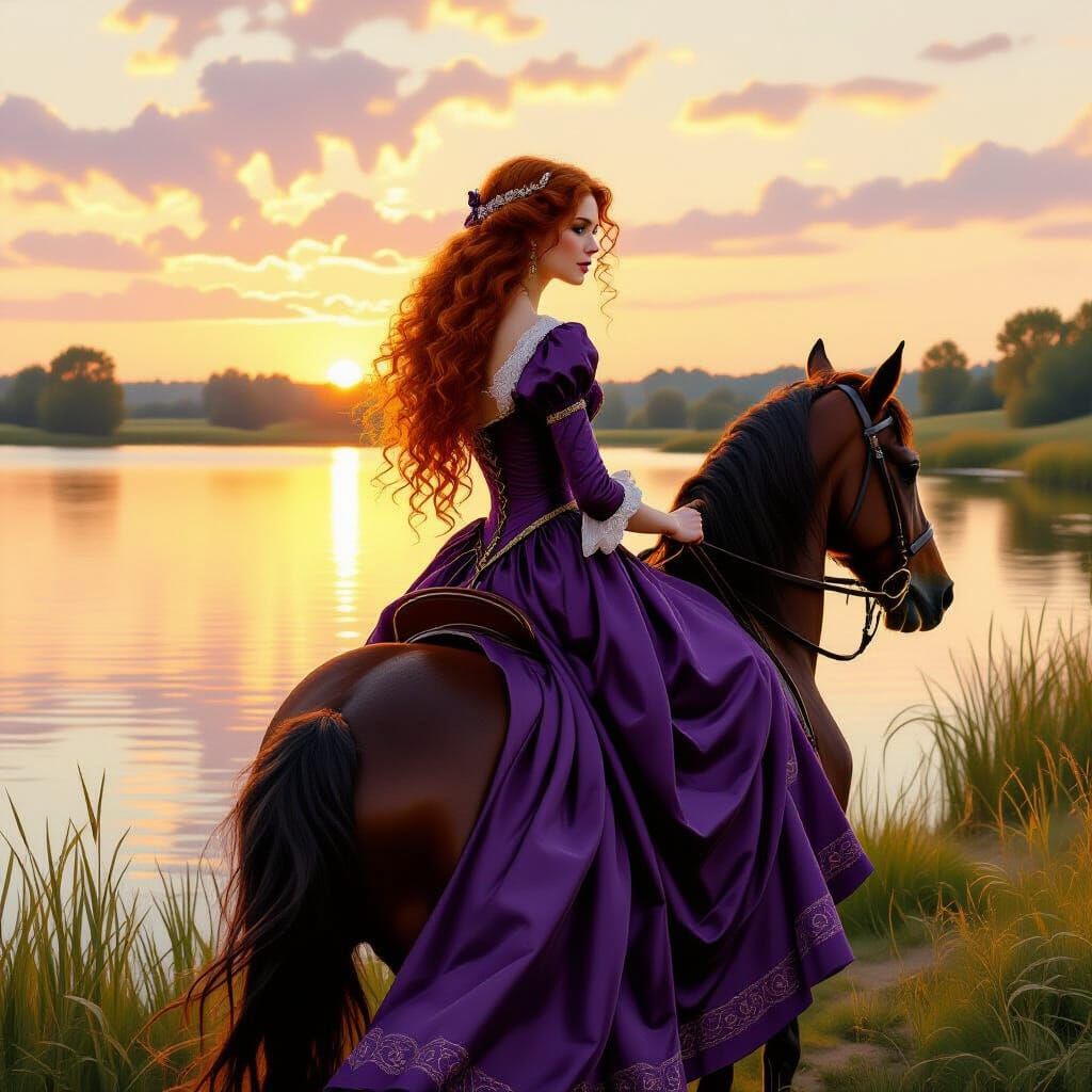 A beautiful woman in a purple 15th-century dress rides a brown-black horse past a lake during golden hour. The image is painted in a romantic, detailed style with vibrant colors.