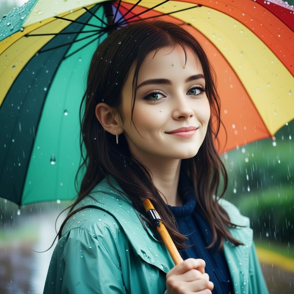 This image features a woman holding a colorful umbrella with rain droplets reflecting vibrant hues. The scene has a dreamy, soft-focus quality.