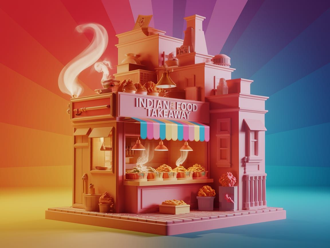 This image shows an Indian food stall in a busy city street, rendered as bright and cheerful 3D digital art. The scene uses a radial gradient and warm light to evoke a joyful, urban atmosphere.