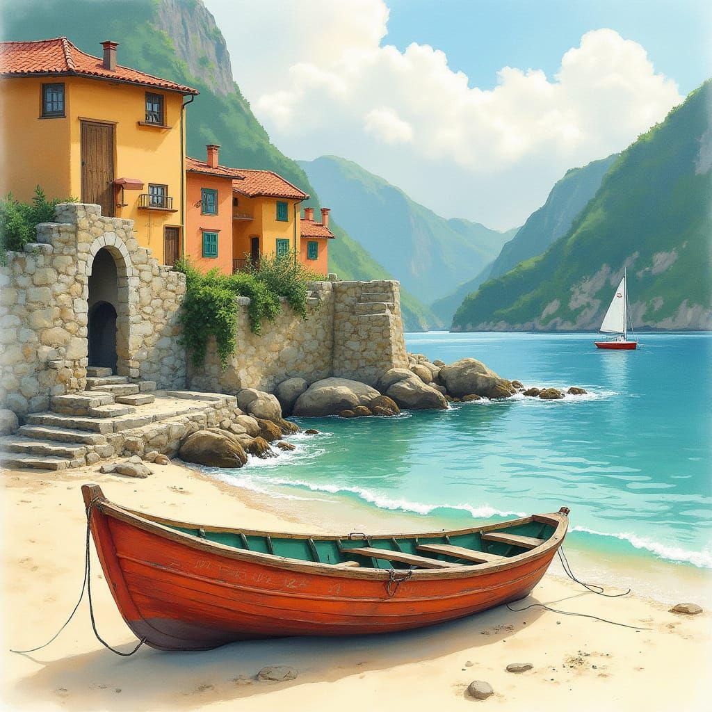This image shows a tranquil seaside village with a weathered red, orange, and green boat on a beach. Buildings with terracotta roofs and mountains frame the scene, rendered in watercolor impressionism.