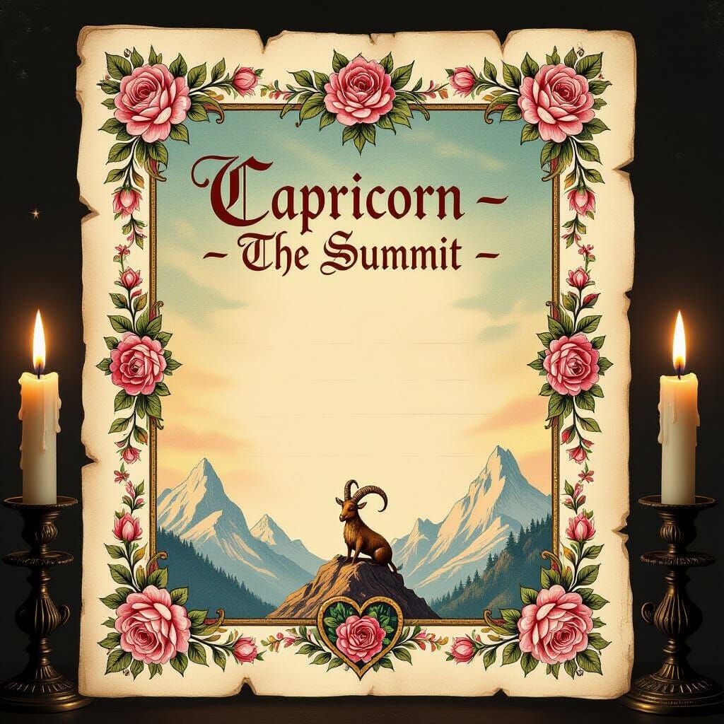 An antique manuscript page featuring ornate rose borders, heart-shaped mountain peaks, and Romantic calligraphy. Illuminated in a style inspired by Doré and Dürer, with warm golden light.