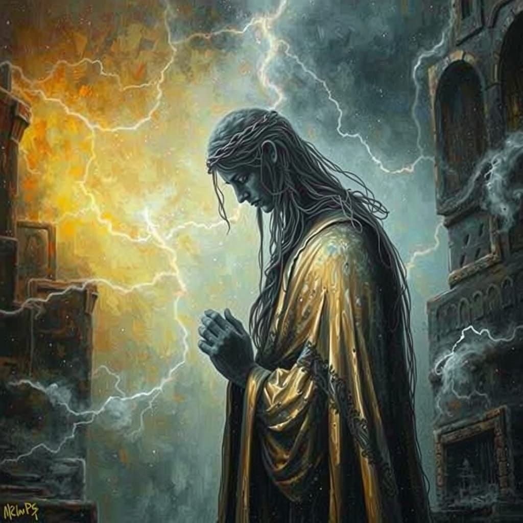 This image shows an ethereal, glowing angel with head bowed next to a large cross of ashes. A dark, cloudy background is illuminated by dramatic lightning in this airbrush-style digital art.