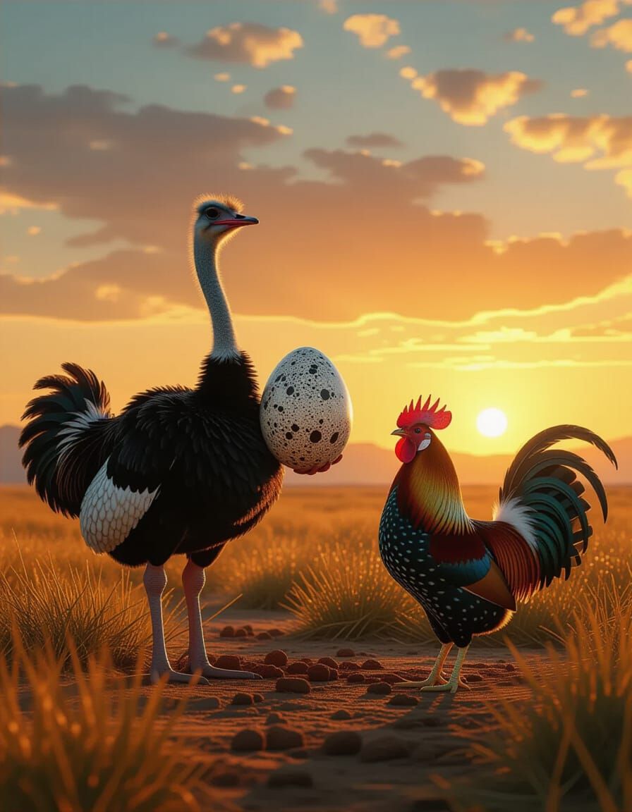 An ostrich proudly presents a large egg to a surprised rooster. This maximalist digital matte painting captures a dramatic, atmospheric landscape during golden hour with intricate details and vivid colors.