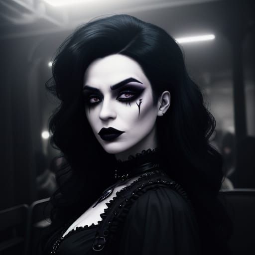 This image shows a cross-dresser striking a confident pose in a subway. The subject has dark hair, bold makeup, and is lit with deep shadows in a gothic surrealist style.