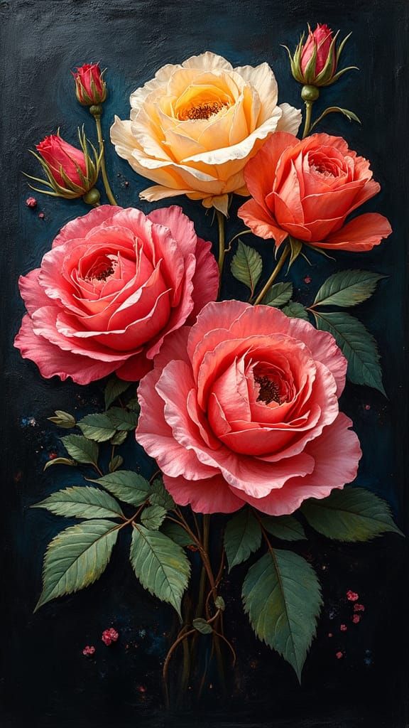 A striking picture of vibrant roses with delicate petals and intricate details contrasted against a deep black backdrop. The painting is rendered with bold brushstrokes and thick, heavy textures in an oil painting style.