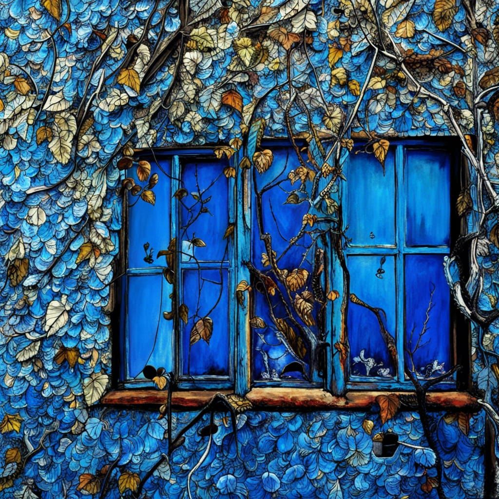 This striking image shows an entirely blue world, including houses, windows, streets, trees, and even people. The artwork features abstract fractal vector graphics with 3D shading.