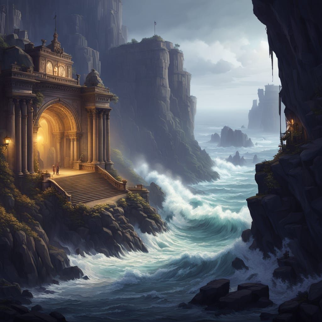This dark fantasy concept art features churning seas and dramatic cliffs shrouded in quivering mist. Dynamic lighting and deep purple/yellow hues create a hyperdetailed, masterpiece scene.
