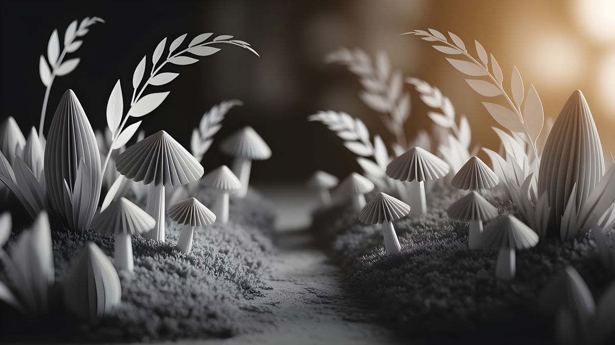 This image features a meticulously crafted charcoal drawing of a serene forest glade under soft, golden sunlight. Delicate paper elements and tiny black and white mushrooms create a stunningly detailed and enchanting scene.