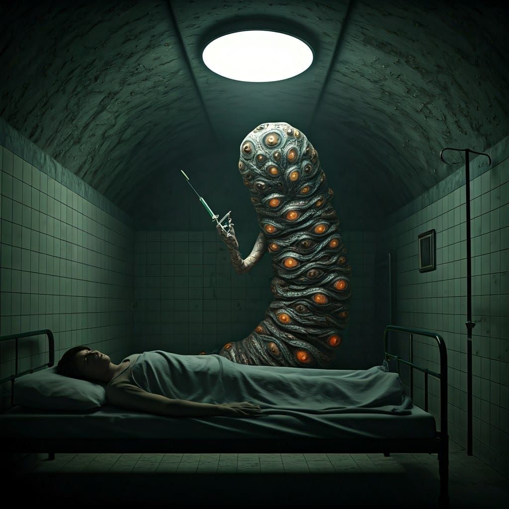This image shows a nightmarish humanoid Azathoth-worm hybrid looming over a sleeping person in a dimly lit room. The creature's form is a mass of pulsing flesh and glowing eyes, in a biomechanical surrealist style.