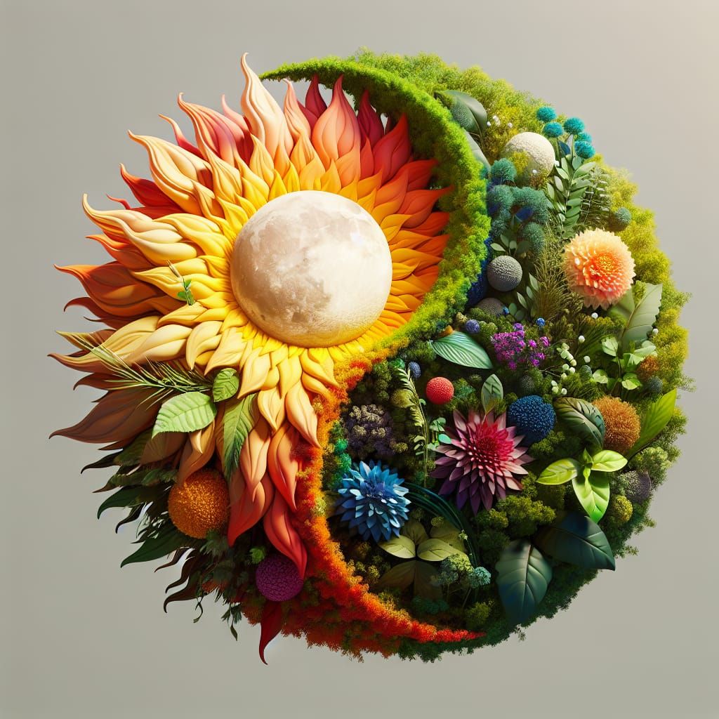 This image shows an abstract 3D shape that represents both the sun and moon, integrated with plants and flowers. Warm colors dominate the sun side, while cool hues define the moon side.