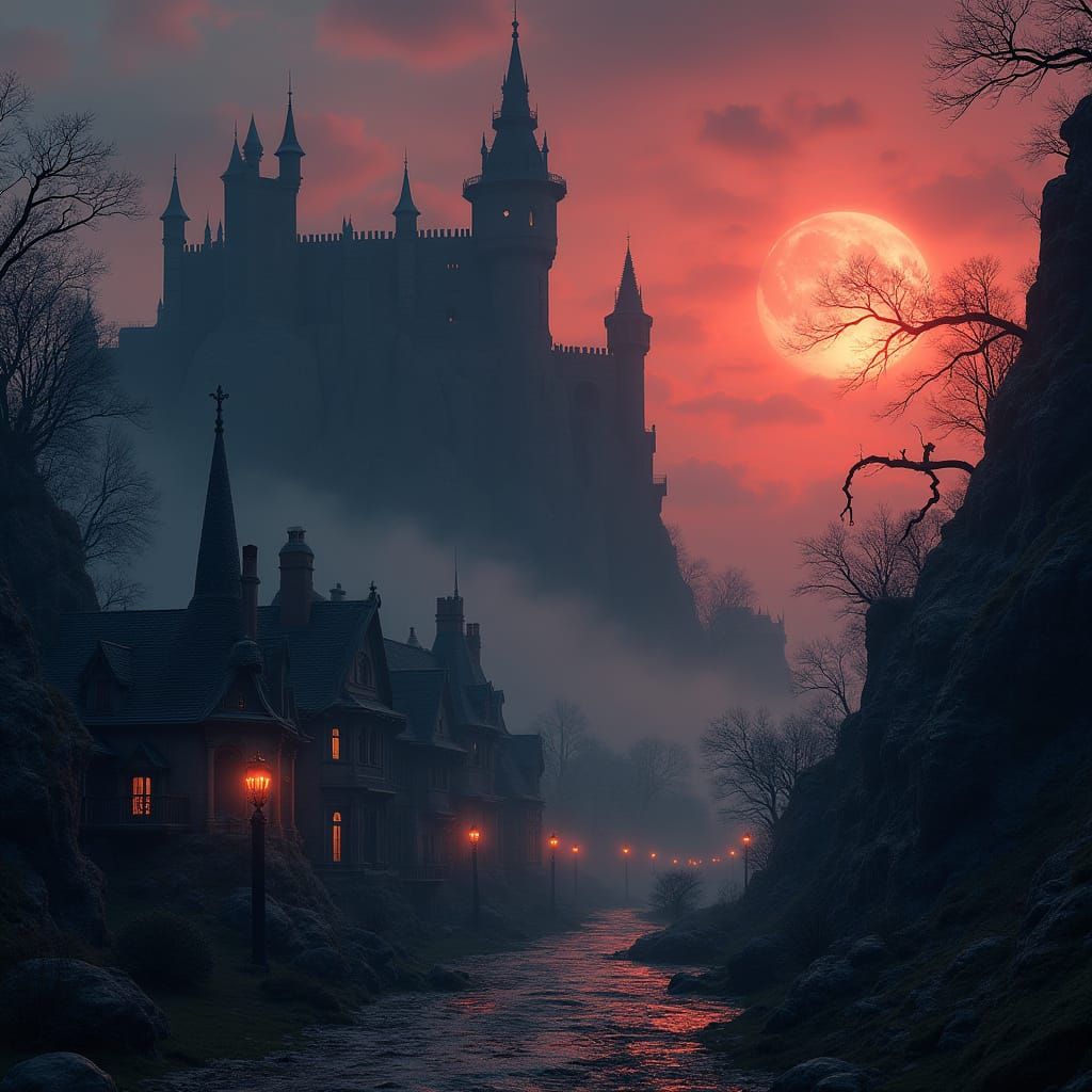 This haunting image depicts a mystical, gothic village at dusk, with a rugged cliffside and the foreboding silhouette of a castle in the background, evoking a sense of foreboding and unease. Inspired by dark romanticism and fantastical elements, this detailed artwork combines rich colors and eerie detail...