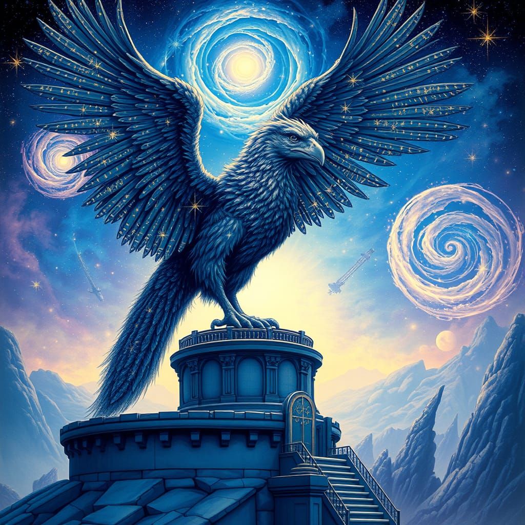 A breathtaking image of a griffin with stardust feathers watching galaxies. Ethereal light and distant nebulae create a dreamlike scene with intricate linework. The artwork has a cosmic horror aesthetic.
