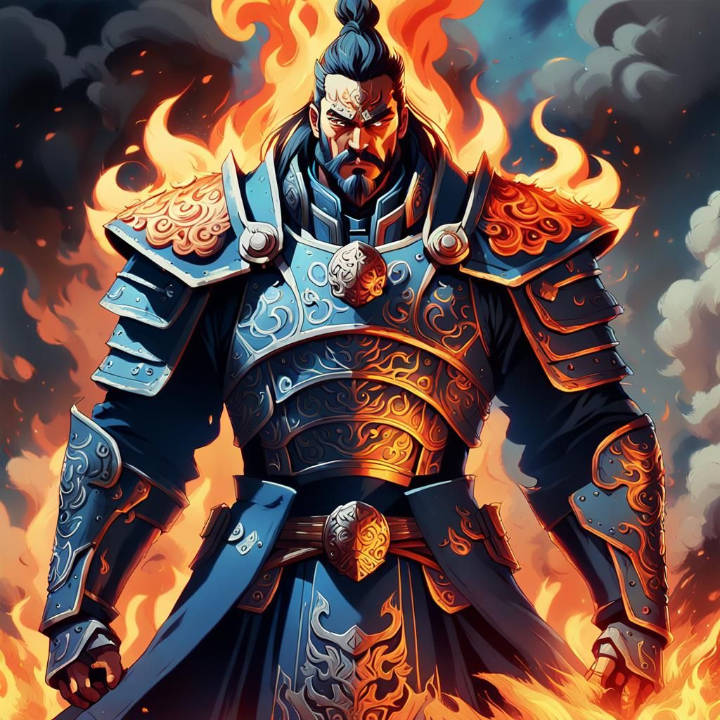 A striking picture of a warlord heroically posed amidst flames and smoke. Rendered in a vibrant anime style with bold brush strokes, the image features dynamic shadows and a warm, fiery color palette.