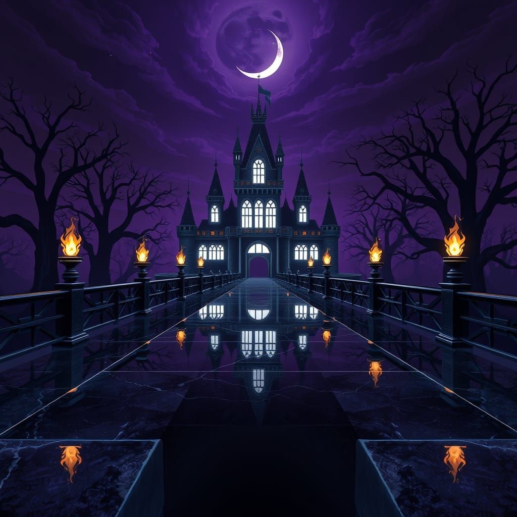 This image depicts a haunting, Nintendo-inspired fantasy landscape with a rich, deep purple sky and a grand, ominous castle. The scene features a sleek, black glass drawbridge, lit black flame torches, and a dark, foreboding void in the distance, all set against a backdrop of eerie, glowing light.