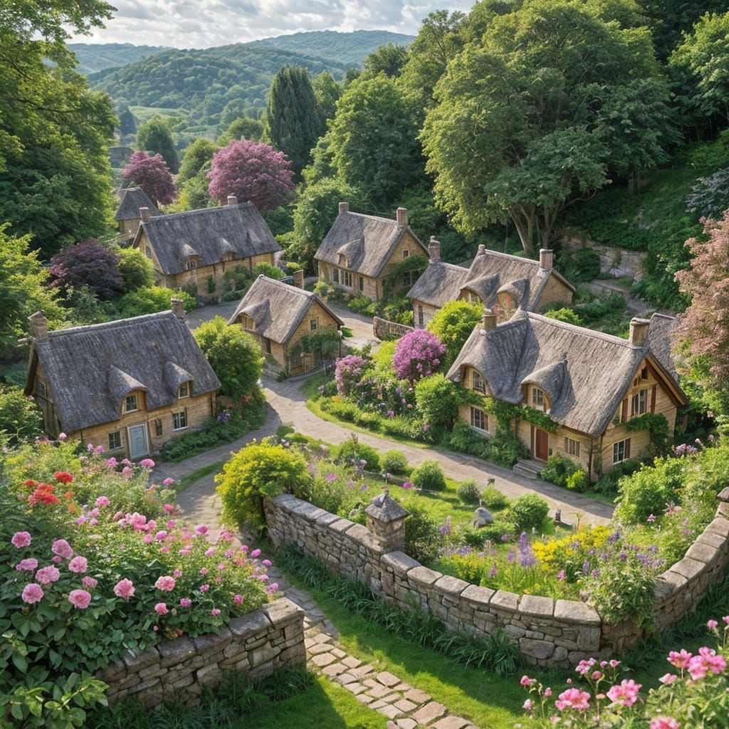 This idyllic scene captures a charming village of stone cottages with thatched roofs, surrounded by lush gardens and ancient trees in full bloom, evoking a sense of serenity and magic.