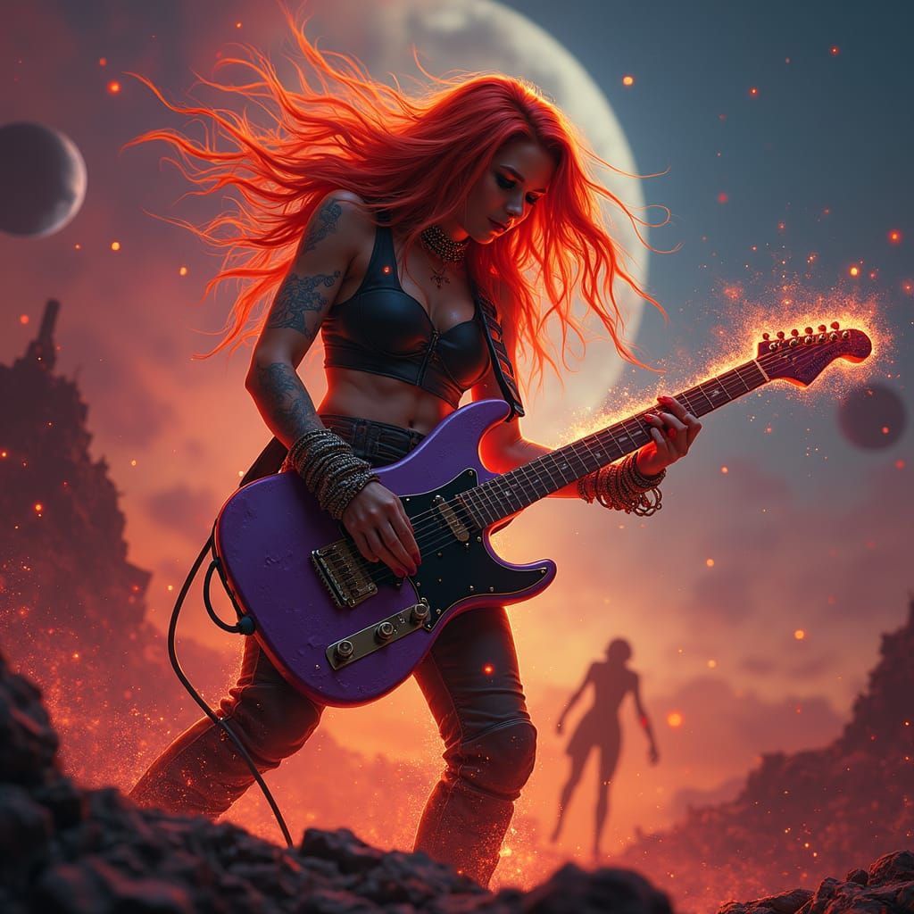 A female rockstar with fiery red hair, shredding a guitar that shoots sparks, on a stage set on Mars. The stage is surrounded by a swirling ...