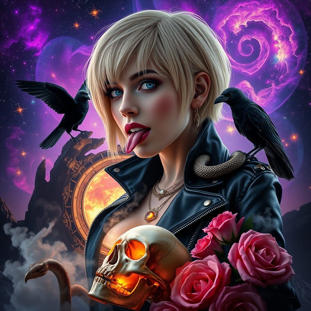 A striking image of a blonde woman in a spiked leather jacket, set against a starry sky. The portrait features surreal elements and a neon glow, in a fantasy matte painting style.