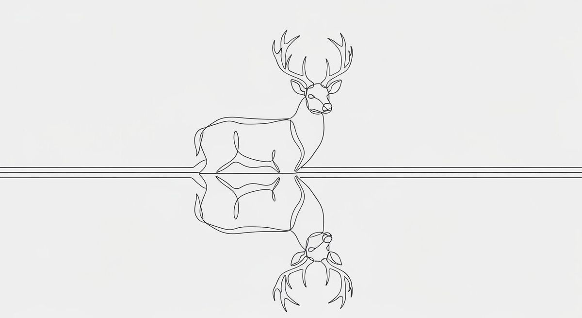 A minimalist single line drawing captures a majestic buck reflected in water. The art features precise, elegant linework with subtle shading.