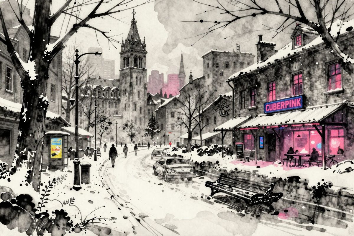 This image depicts a winter wonderland with a cyberpunk aesthetic, rendered in the style of European ink art and watercolors. A unique blend of technology and nature.