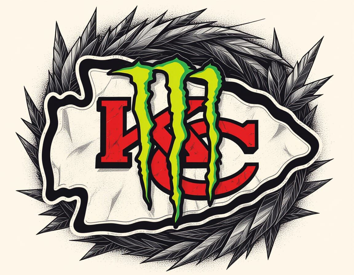 A hyperdetailed charcoal drawing of the Kansas City Chiefs and Monster Energy logos intertwined. The image features intricate textures, shading, bold lines, and high contrast values.