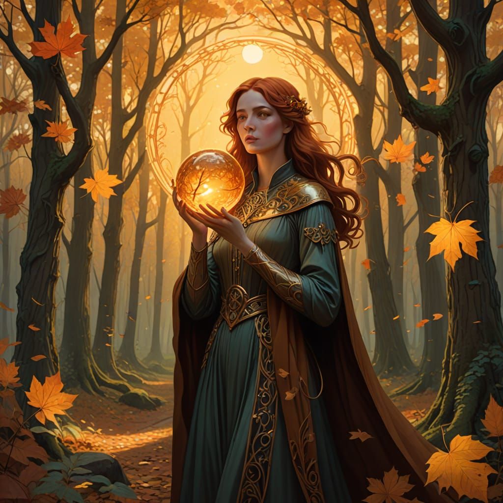 This Art Nouveau illustration features a woman with auburn hair in a forest clearing, holding a glowing orb. The digital matte painting showcases ethereal textures and warm, golden hour lighting.