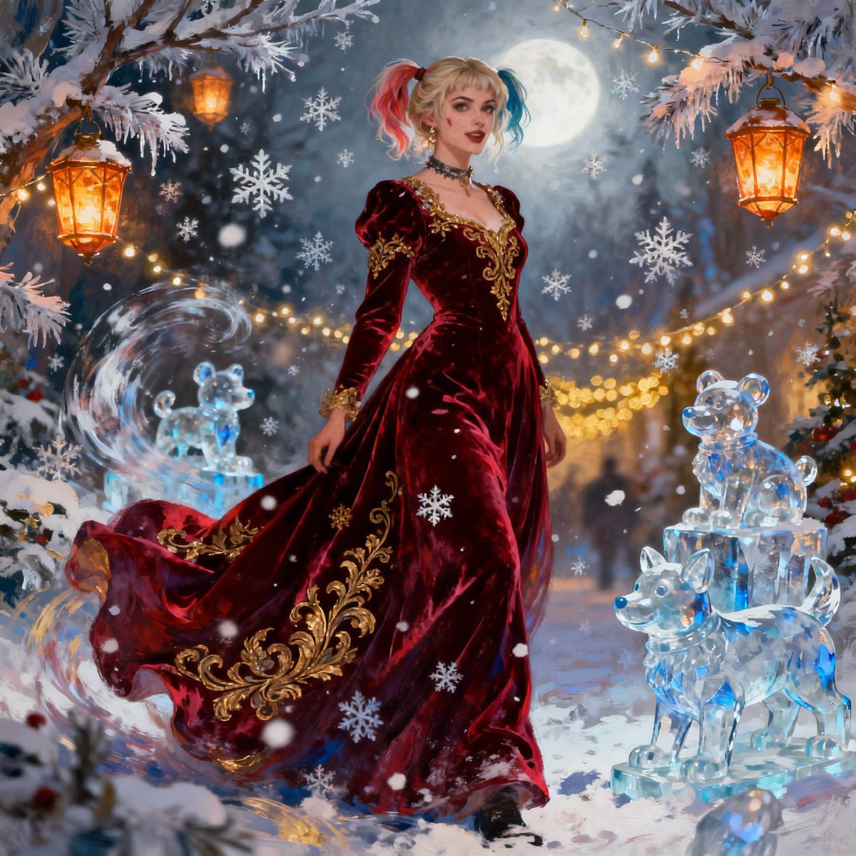 A magical winter scene with Harley Quinn in a crimson velvet Christmas dress amidst sparkling snow, ice sculptures, and glowing lanterns, rendered in a vibrant, painterly digital art style.