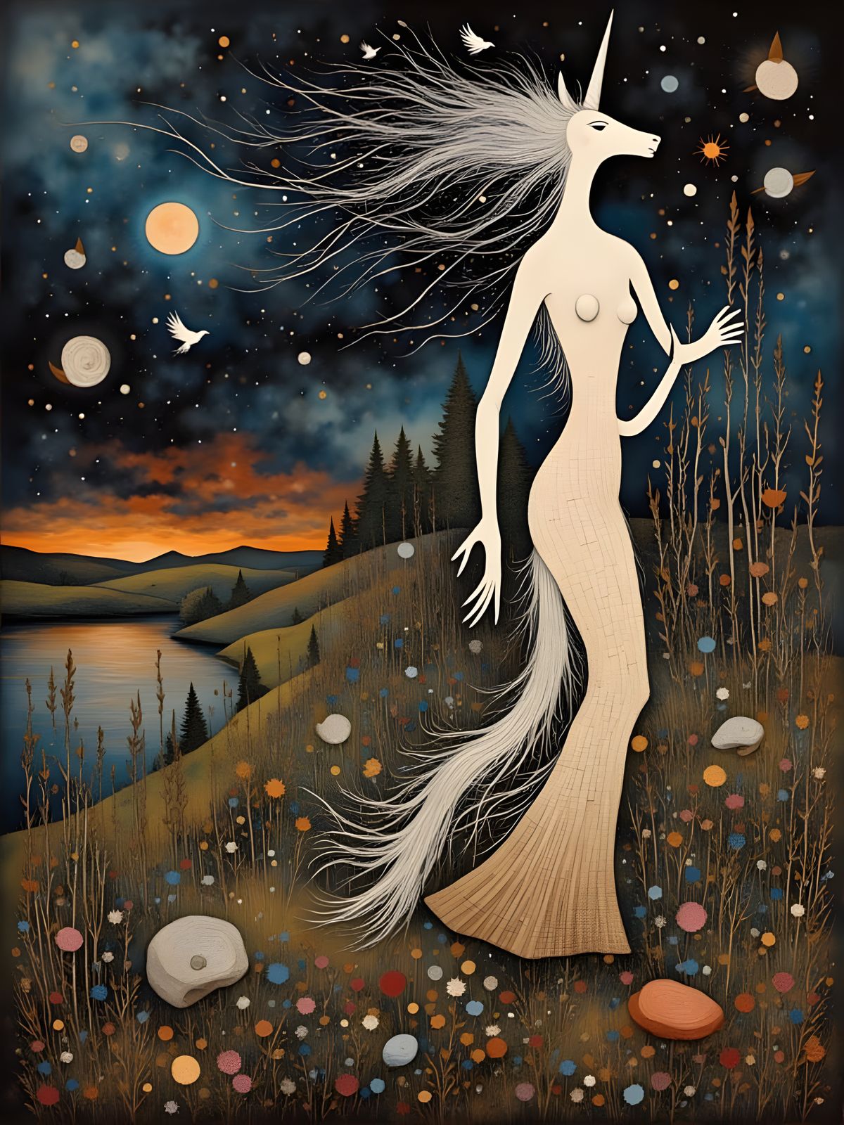 <lora:Mythoglyphic:1.0> <lora:The Magic Loch flux:1.0> Abstract woman with unicorn horn. Dancing in a hill. Portrait. Pastels. Scratch art. Memories of happiness within the gloom. Whispy. People and blue with sunset colours. Plaid. Birdcage. Fossils. Pastel on black. Surreal art in the style of Kay Sage. ...