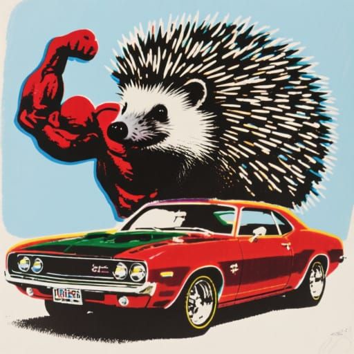 This image features a hedgehog driving a classic Plymouth muscle car, rendered in the vibrant, pop art style inspired by Andy Warhol and William Blake.