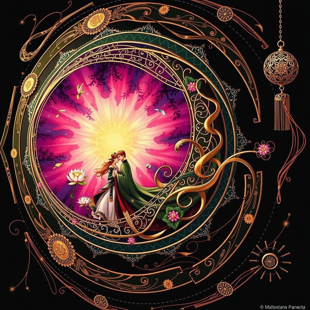 This image shows two figures in elaborate, colorful costumes embracing. The scene includes floral motifs and a lush forest backdrop, rendered with attention to detail.