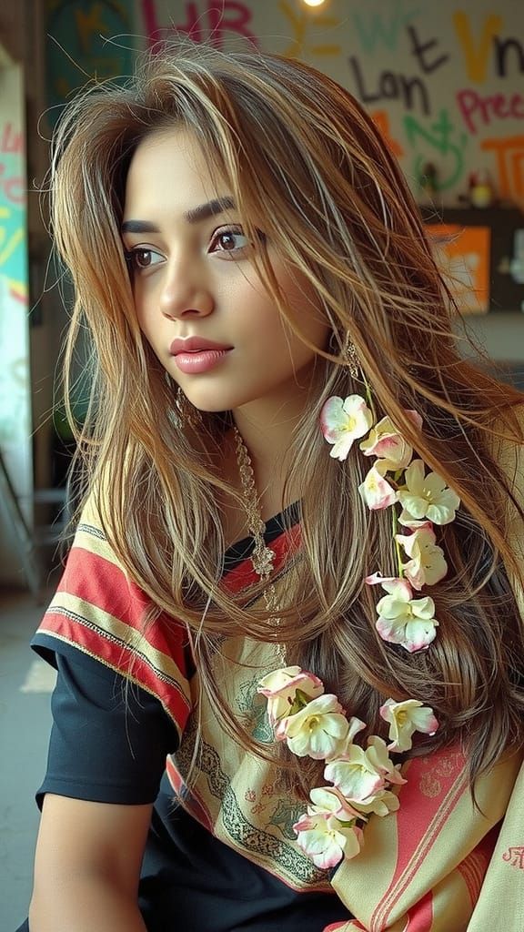 This image shows a serene Indian woman surrounded by vibrant street art, blending graffiti, spray paint, and oil gouache elements in a colorful, high-contrast style reminiscent of dynamic and detailed digital art.