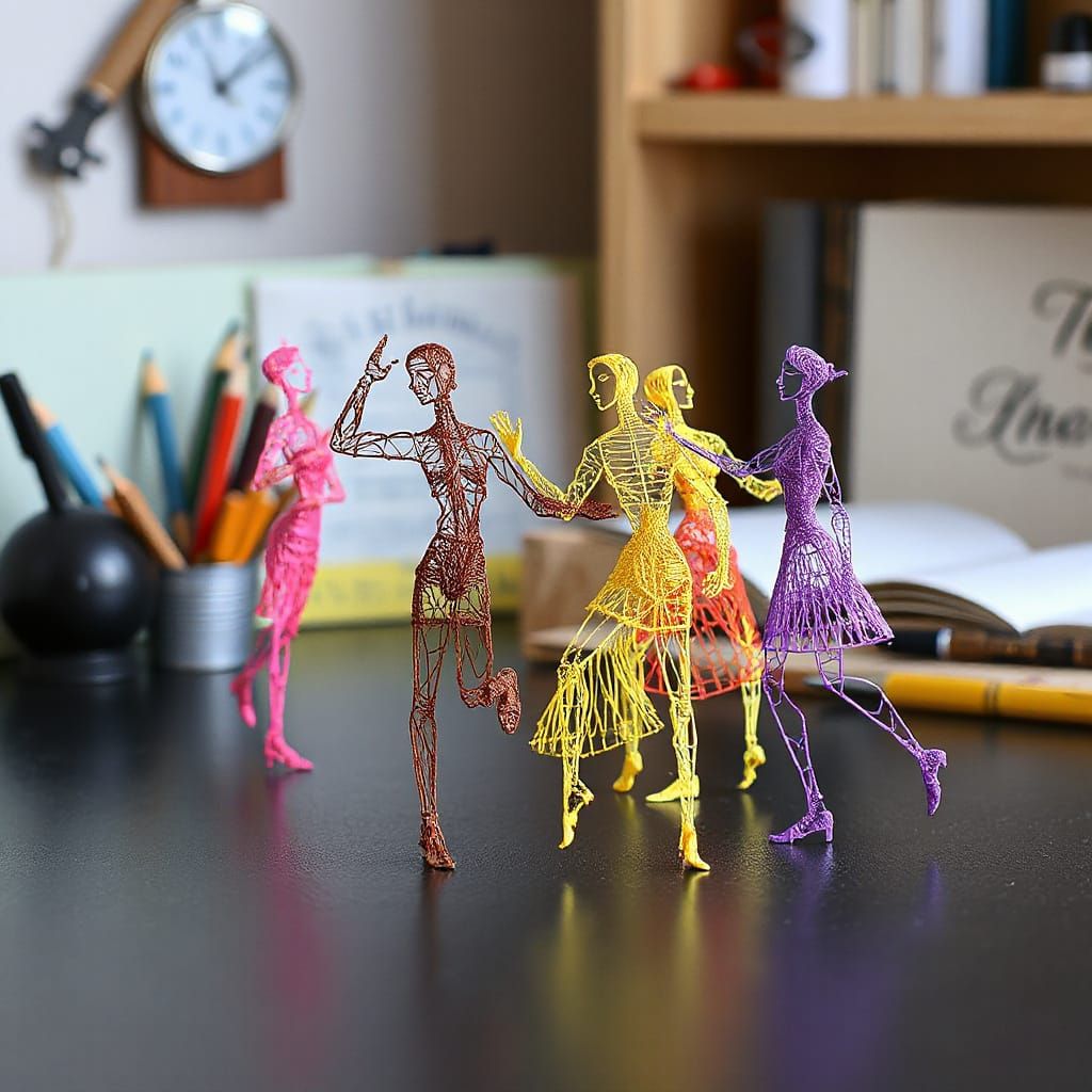This image shows a vibrant wire sculpture of dancing figures on an artist's desk. The origami-style papercraft sculpture is rendered in high resolution with a soft focus.