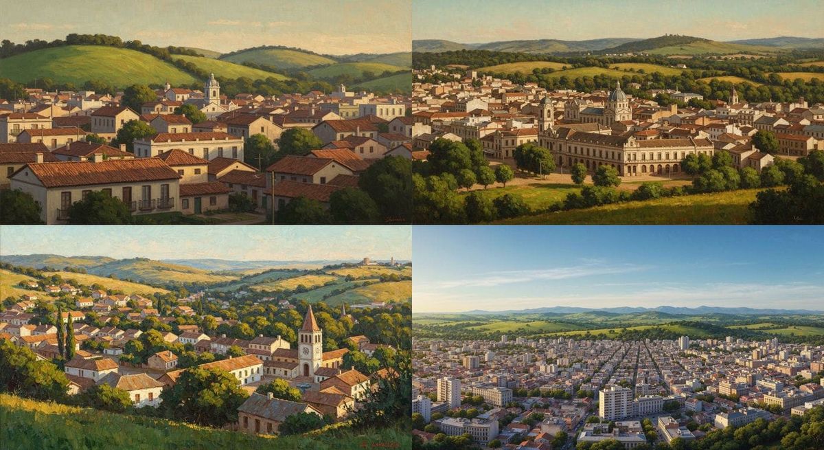 This AI-generated image depicts a cityscape of Minas, Uruguay, in the distinct Lavalleja style, showcasing its unique urban landscape.