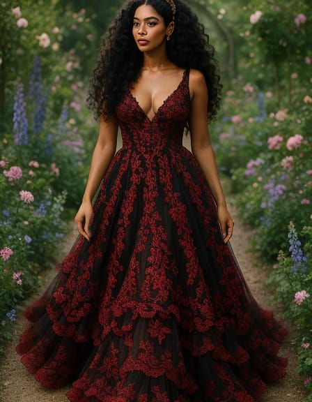 A vibrant oil painting depicts a woman walking through a magical garden. The image features golden hour lighting, embroidered ruffles, and flowing curly black hair in a surreal style.