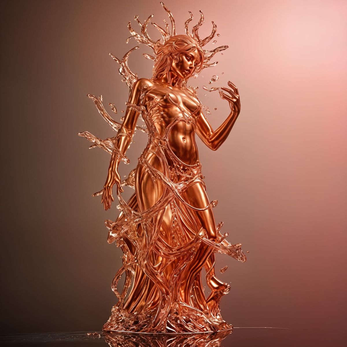 This image displays an intricate, hyperrealistic statue crafted entirely from flowing liquid water, capturing a unique and dynamic form.