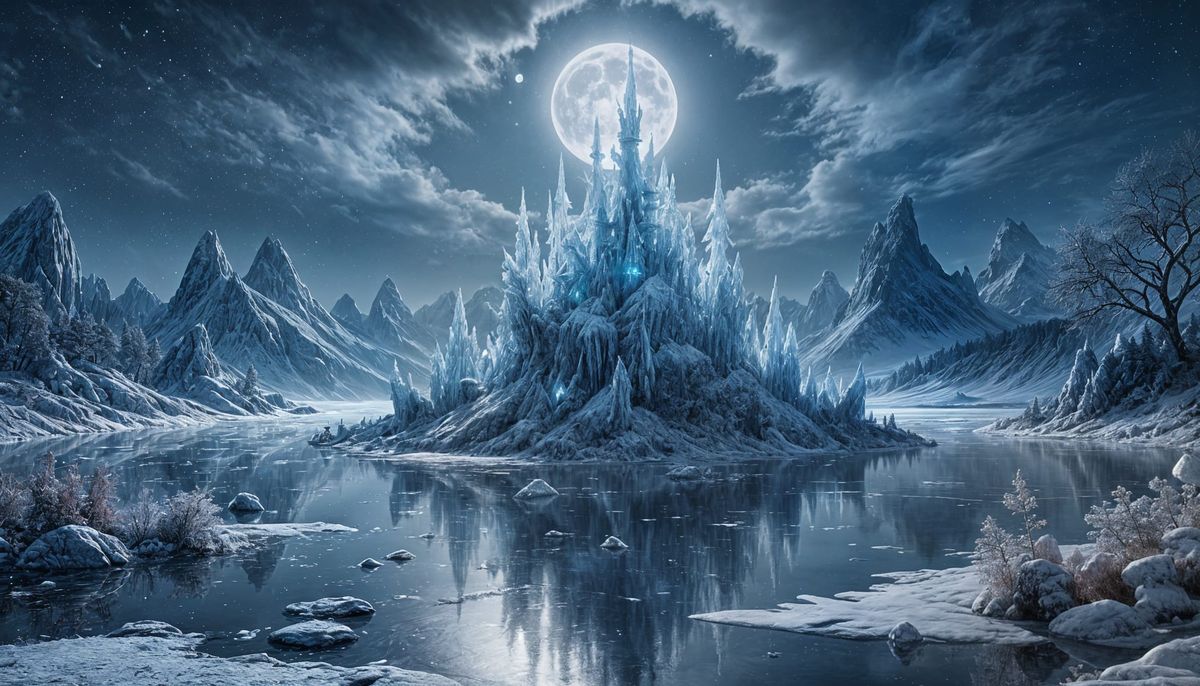 This image shows a hyperdetailed crystal garden emerging on a frozen lake beneath a bright full moon, rendered in cool, vibrant colors.