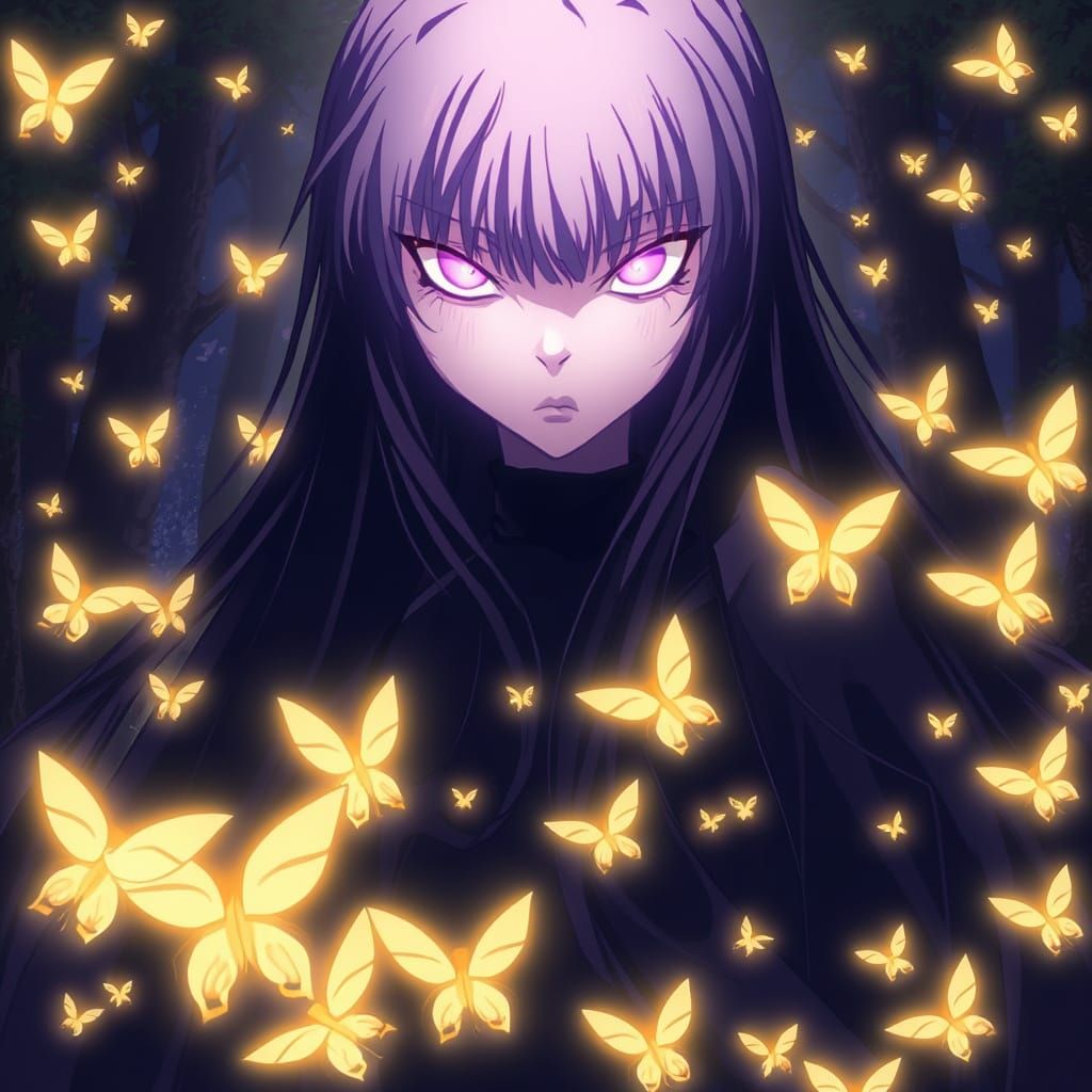 This image shows a mystical figure with long hair and fierce eyes set against a dark forest backdrop, surrounded by a swarm of golden pixies in a vibrant, otherworldly scene, blending elements of anime and Japanese manga styles.