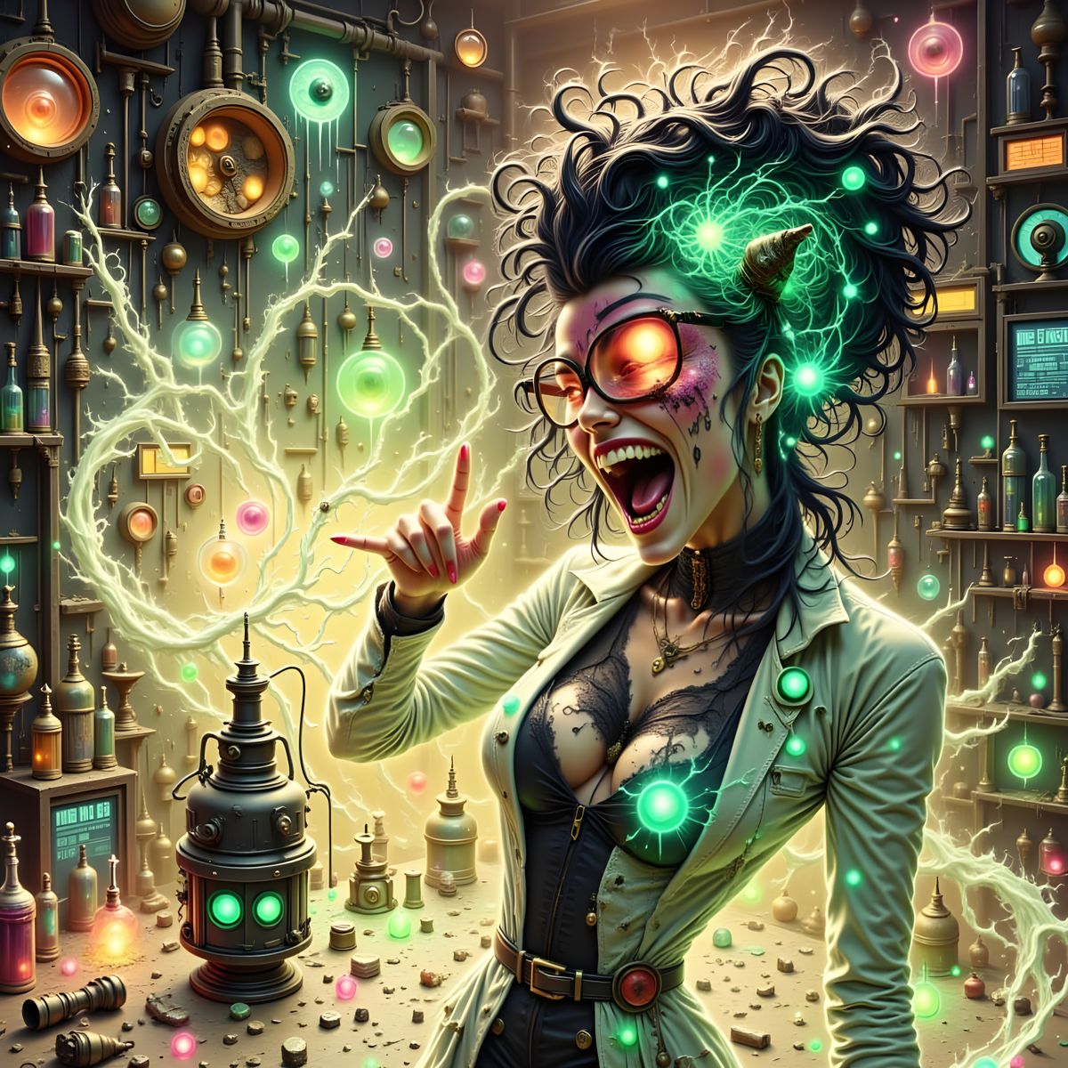 This image shows a fantastical, anime-inspired woman scientist with an otherworldly aura, radiating an eerie, iridescent glow amidst a surreal, chaotic atmosphere.