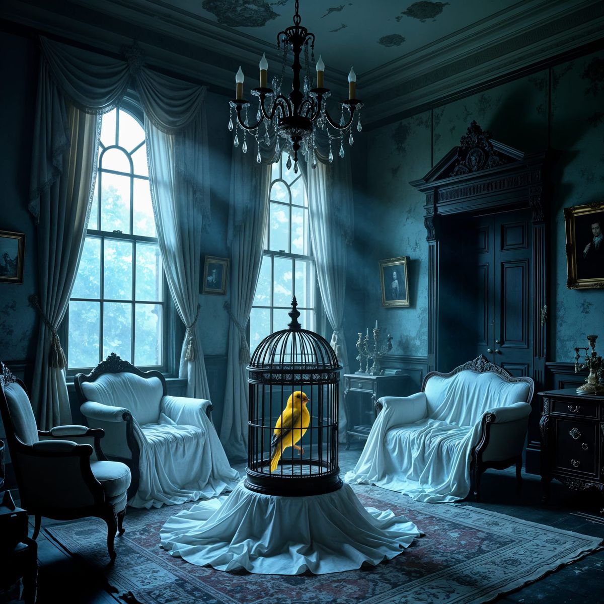 This charcoal drawing captures a haunting scene in an abandoned Victorian mansion, with a single vibrant yellow canary as the only color, symbolizing resilience. Features dramatic lighting and rich textures.