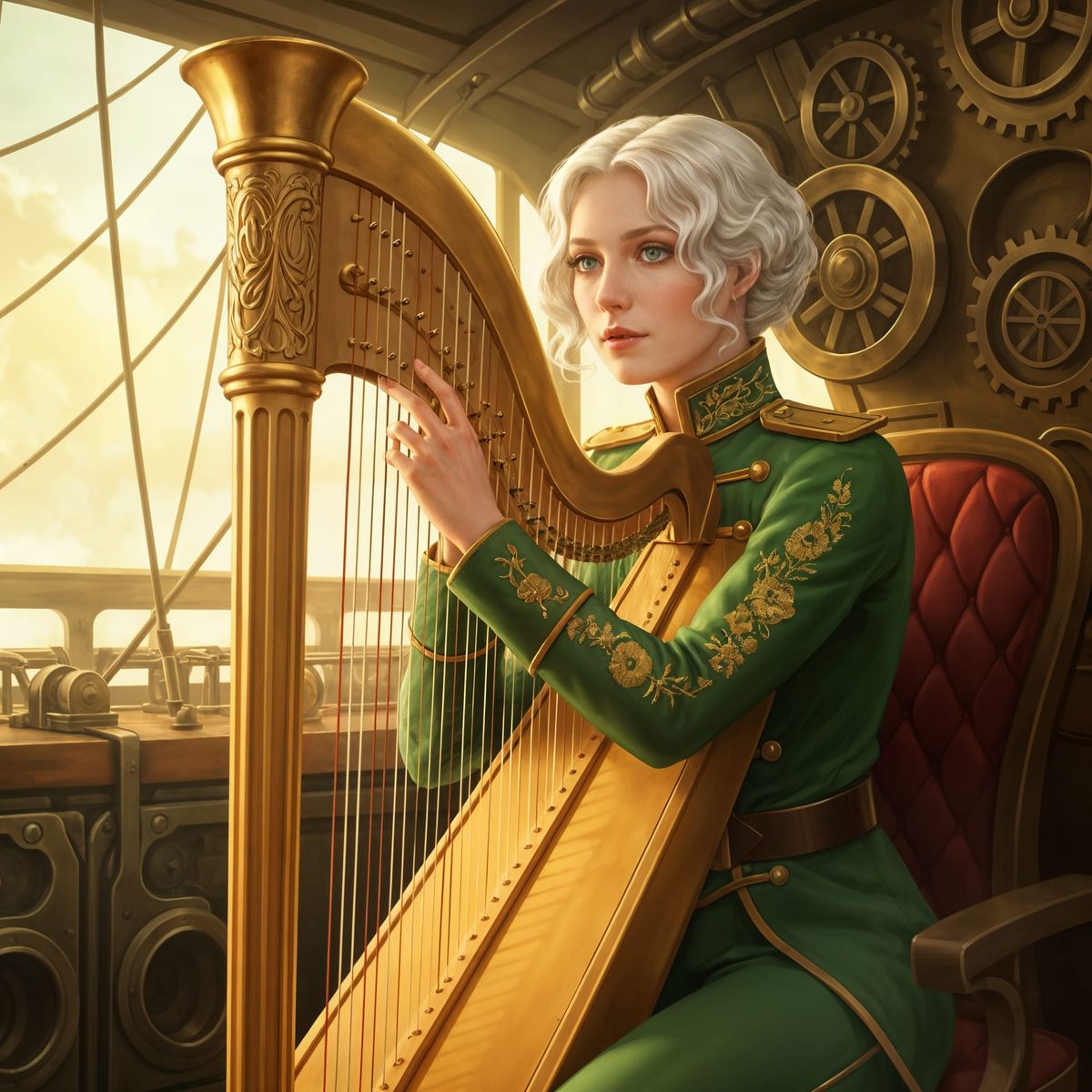 A young woman with platinum blonde hair and green eyes plays a golden harp aboard a steampunk airship. The image features intricate floral embroidery and brass details, capturing a serene atmosphere.